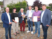 V.l.n.r.: Verbandsgemeindebürgermeister Markus Lüttger, Susanne Huber, Alt-Bürgermeister Franz-Josef Jost, Bürgermeister Christoph Jäckel, Georg Ramm und der 1. Beigeordnete der VG Rüdesheim Heinz-Martin Schwerbel